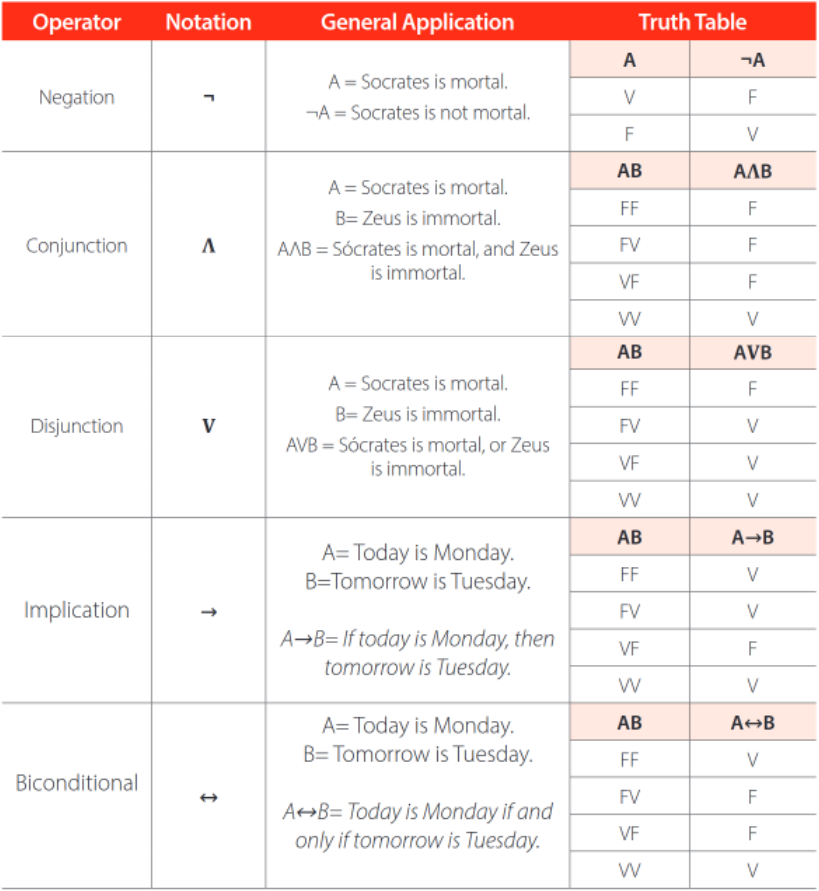 Prepositional logic is a formal system that allows us to perform operations on statements or sets of data using logical operators that allow us to obtain the degree of veracity of these, as shown in the following table: