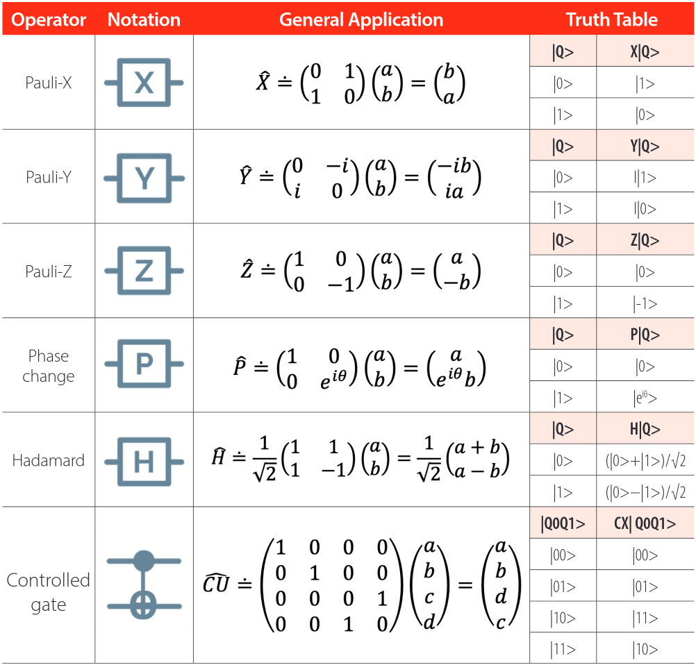 Quantum gates allow modifying the state of one or more qubits in a way analogous to logic gates. The following table shows the fundamental gates: