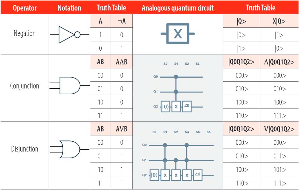 Although in both quantum logic and prepositional logic we find that operators are used to modify the state or the information that we have at the beginning, there is no one-to-one analogy between these operators with the exception of negation and the Pauli X gate. However, quantum circuits can be built to perform analogous operations to those found in prepositional logic, as long as the following rules are fulfilled.