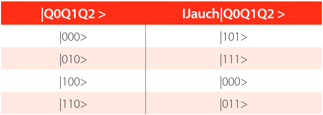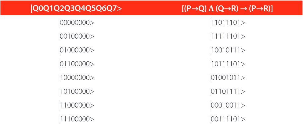 From the above, we take as inputs only those where the qubits Q3, Q4, Q5, Q6, and Q7 are initialized in the base state 0, so our analogous truth table is as follows: