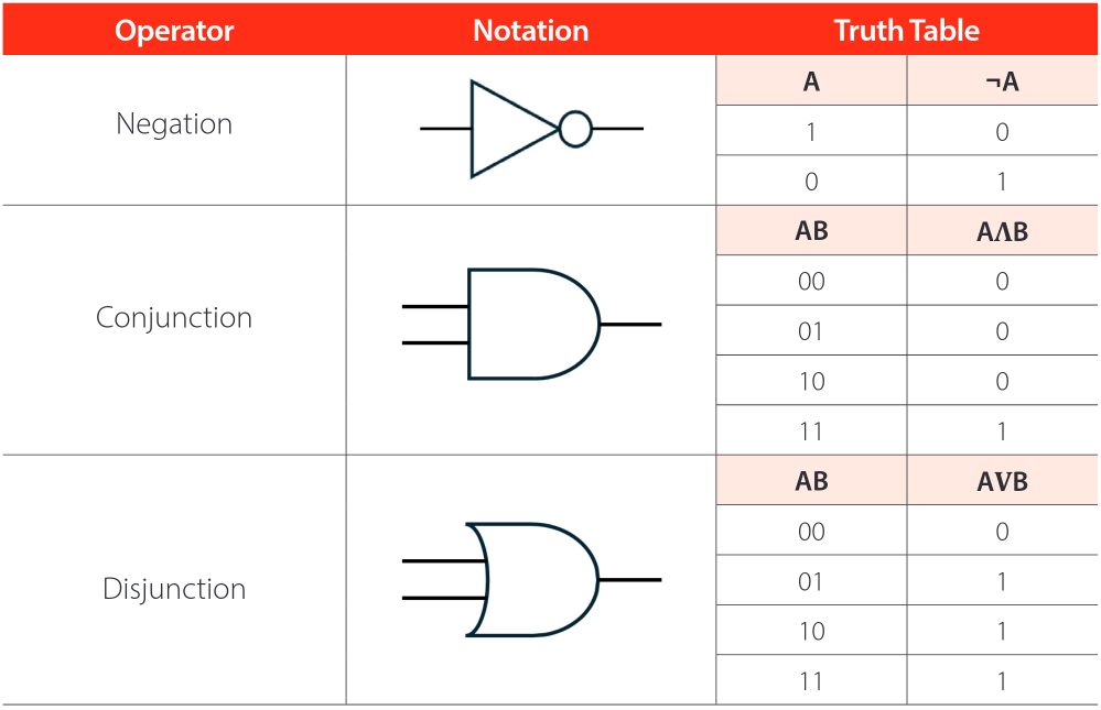 Combinational logic circuits are a set of logical gates that execute the logical operators corresponding to negation, union, and disjunction. These allow complex operations to be performed using the values zero and one, true and false, or another binary system.