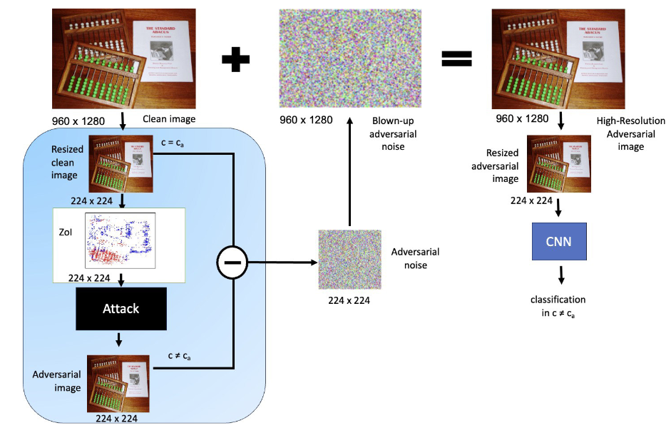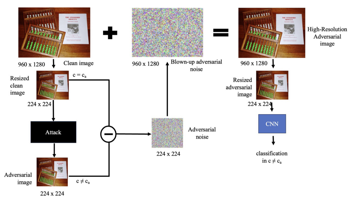 In a nutshell, in the Noise Blowing-Up (NBU) generic strategy [8] illustrated in Figure 2, a clean HR image is reduced with a resizing interpolation function to fit the CNN C’s input size. ca denotes the category in which C classifies this resized clean image. Then an attack atk is performed in the LR domain on this image to create an adversarial image classified in c ≠ ca (which may be a predefined category ct in the target scenario). The adversarial noise is extracted in the LR domain and then blown-up to the HR domain to fit the original clean image size. This blown-up noise is then added to the HR clean image, leading to a HR tentative adversarial image. This image is again processed to fit C’s input size. If C classifies it in c, one has obtained that way a HR adversarial image.