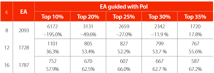 When ∈ is increased, the performance of EA increases for all the top x% values. The best performance, in terms of the number of generations, of the EA with PoI is obtained when the top 35% of relevant pixels are used with ∈ = 16. It results in a 67.2% speed increase compared to the EA without PoI guidance. For ∈ = 16, Figure 4 shows how EA converges to the target category without PoI on the one hand, and with PoI using top 35% of the most relevant pixels for the (acorn1-rhinoceros beetle) ancestor-target pair on the other hand. EA’s learning period is drastically shortened when one uses PoI. Indeed, using PoI, the EA finds the path to the target category almost 60% faster than without PoI. This acceleration behavior is consistent across most of the ancestor-target pairs.