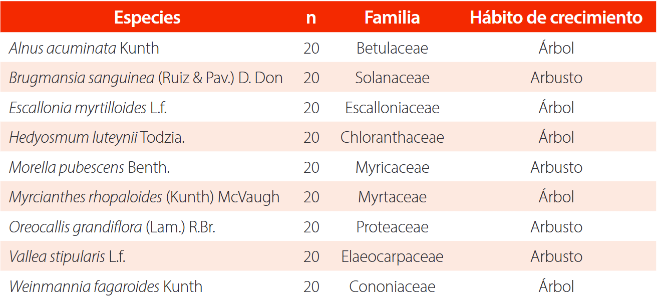 Se seleccionaron nueve especies leñosas de mayor abundancia que se encuentran compartidas en los cuatro sitios de estudio. La Tabla 1 indica las especies consideradas para el estudio: cinco fueron especies de hábito de crecimiento arbóreas y cuatro especies de hábito de crecimiento arbustivas. Por especie se seleccionaron 20 individuos (cinco en cada sitio), lo que da como resultado 180 muestras. Sólo se consideraron plantas con diámetro a la altura del pecho (DAP) mayor a 5 cm, con la finalidad de que permita la extracción de una muestra de madera válida [32, 33].