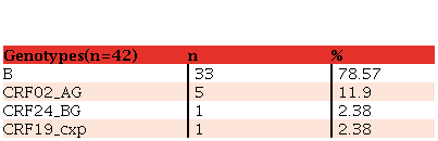 Of the 42 subjects, 30.24% were categorized as ART drug-experienced and 67.4% as ART drug-naïve subjects. The average viral load and CD4+ count was 7.2x10⁵ copies/mL and 267.68 cells/mm³, respectively. Also, 54,76% (23/42) were considered as only HIV-1 seropositive and 45.2% (19/42) as HIV/AIDS. Regarding coinfections, syphilis was found in 20% of MSM naïve patients and hepatitis B infection in 11.9%. All information was gathered from the clinical records and through a questionnaire. The remaining descriptive data are provided elsewhere (Table 1).
