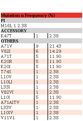 TABLE 3. Mutations and frequency in PI gene in naïve and experienced HIV patients attending a clinic in Quito.