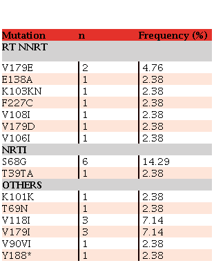 TABLE 4. Mutations and frequency in RT gene in naïve and experienced HIV patients attending a clinic in Quito.