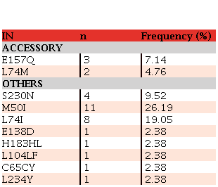 TABLE 5. Mutations and frequency in IN gene in naïve and experienced HIV patients attending a clinic in Quito.