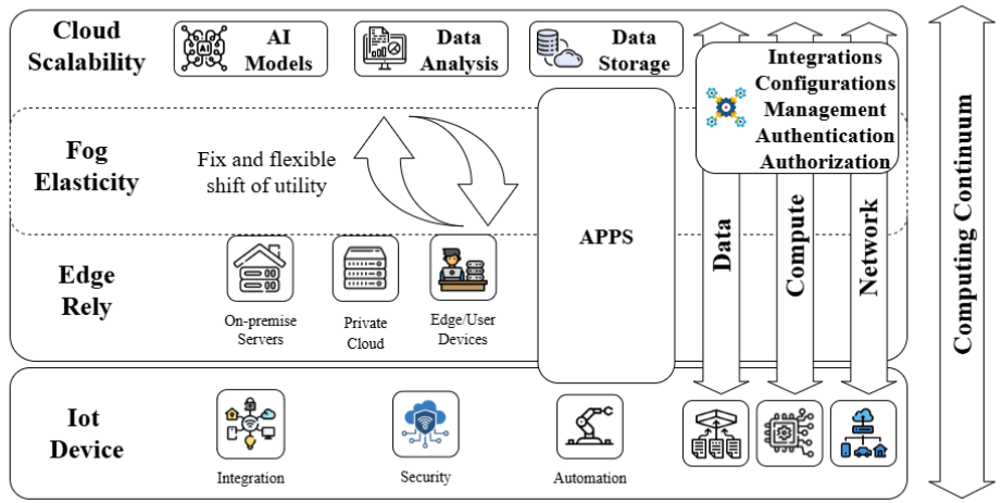 Traditional cloud architectures often fall short when confronted with the demands of Fig. 1, paving the way for emerging paradigms like fog computing, edge computing, and compute continuum. Fog computing serves as an intermediary layer between the cloud and edge, spanning across multiple network topology layers [41]. Conversely, edge computing involves nodes close to IoT devices, often embedded within them [42]. Fig. 1 extends the cloud by integrating energy-efficient and low-latency devices closer to data sources at the network edge [22]. This amalgamation of fog, edge, and IoT entities endows diverse capabilities such as analysis, processing, storage, and data generation [43].