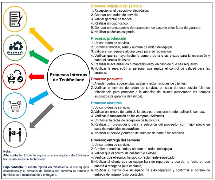 A partir de la información proporcionada por Techfusione, se diseñaron los procesos internos, así como las actividades a realizar en cada uno de ello.