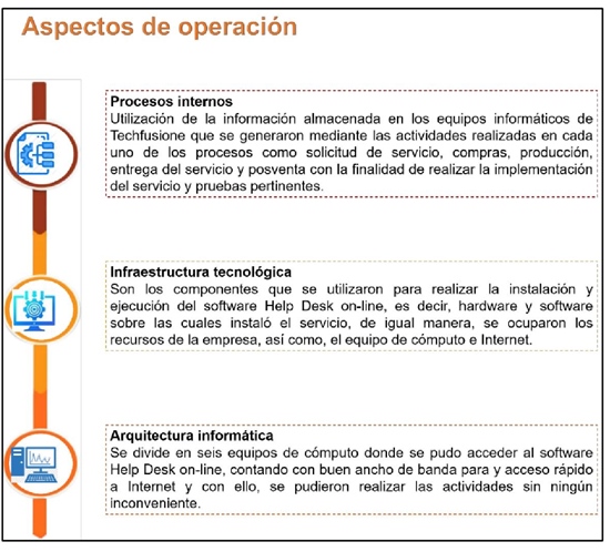 La operación del servicio tiene como objetivos la coordinación y ejecución de las actividades y procesos necesarios para entregar y gestionar servicios para usuarios y clientes con el nivel especificado [6]. En esta fase se realizó la selección del software Help Desk para el diseño del prototipo que consta de tres aspectos: procesos internos, infraestructura tecnológica y la arquitectura para la instalación y ejecución del mismo (los cuales se muestran en la figura 2), siendo esta el nexo que une las metas de negocio con el sistema de software para agilizar las actividades que se realizan aportando flexibilidad, automatización de la infraestructura y herramientas necesarias para reducir los costes de integración.