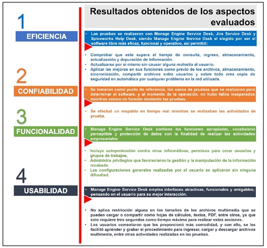 Asimismo, se utilizaron métricas internas de calidad: eficiencia, confiabilidad, funcionalidad y usabilidad para la selección del software optimo, para ello se seleccionaron tres softwares del mismo rubro: Jira Service Desk, Manage Engine Service Desk y Spiceworks Help Desk, cada uno de ellos fueron evaluados de acuerdo a sus funciones y características peculiares, conforme a la experiencia obtenida en la instalación del software, el conocimiento del grado de manejo, así como sus funciones e interfaces atractivas. Finalmente, se decidió utilizar el software Help Desk on-line denominado Manage Engine Service Desk, la figura 3 muestra los resultados obtenidos de la evaluación.