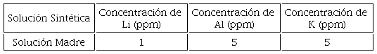 Las soluciones sintéticas (madre) se prepararon disolviendo una cantidad requerida de Li, Al y K (Tabla 1) en una solución de 0.2% de H2SO4, donde se prepararon 3 diferentes soluciones sintéticas, ajustando su pH en 1, 1.5, 2, 2.5 y 3 usando el mismo H2SO4.