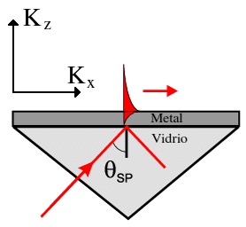 En la figura 1, se muestra que la luz dentro de un plano está compuesta por dos componentes vectoriales: la componente paralela kx a la superficie del metal y la componente perpendicular kz a la superficie.