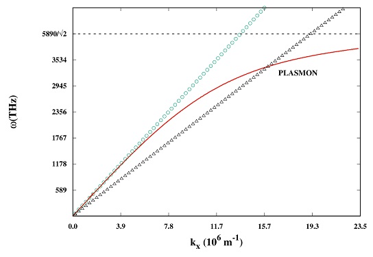 El rango del espectro visible de la figura 4 se encuentra entre 2071 a 4712 THz, en el eje vertical. Además, se indica una frecuencia con valor de 5890/√2 THz, debido a que los modos normales que se excitan a frecuencias iguales o más elevadas al valor indicado, se denominan plasmones radiativos. Debido a que en este trabajo se presentan los llamados plasmones no radiativos, las frecuencias más elevadas no son de interés.