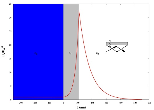 Existen expresiones para obtener de forma analítica la amplitud del campo magnético H bajo el PS en ATR Kretschmann, como la ecuación 10 obtenida en la referencia [3], sin embargo, en el presente trabajo se realiza por el método de matriz de transferencia, en el cual se compara el campo de la superficie con el campo incidente bajo el PS.
