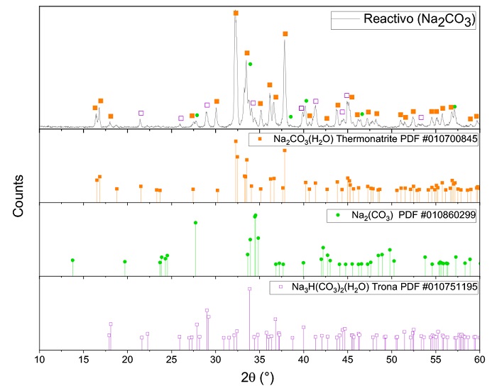 Los reactivos utilizados en la experimentación se analizaron mediante DRX. Los difractogramas correspondientes se presentan en la siguiente sección. En la Figura 1 se observa el espectro de difracción del reactivo de Na2CO3 utilizado. Los picos característicos observados corresponden a termonatrita, Na2CO3 y trona, los cuales fueron identificados con los patrones de difracción 01-070-0845, 01-086-0299 y 01-075-1195 respectivamente.