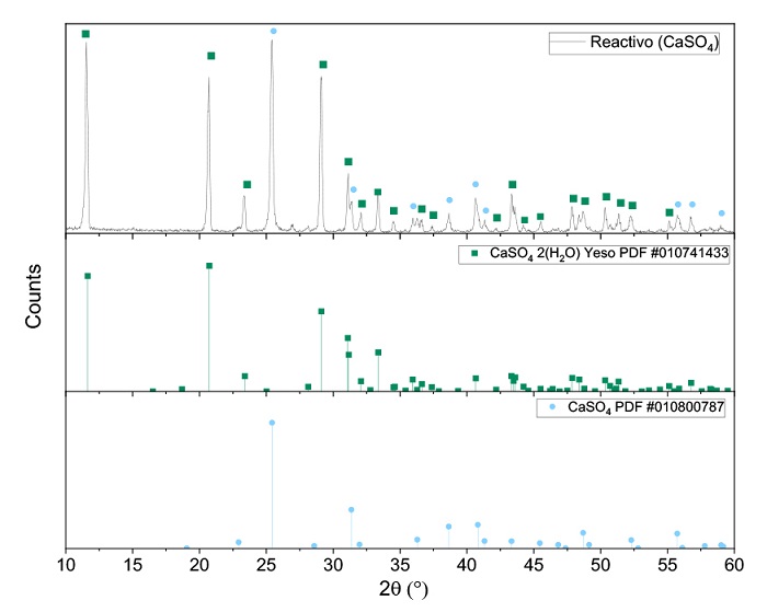En la Figura 2 se presenta el espectro de difracción del reactivo de CaSO4.2H2O utilizado. Los picos característicos observados corresponden yeso (CaSO4.2H2O) y CaSO4, los cuales fueron identificados con los patrones de difracción 01-074-1433 y 01-080-0787, respectivamente.