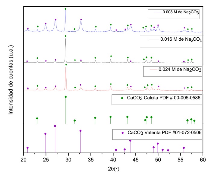 Los sólidos obtenidos de la reacción de precipitación se analizaron mediante DRX. Los difractogramas correspondientes se presentan en la Figura 4. Los picos característicos observados corresponden a calcita y vaterita (poliformo de la calcita), los cuales fueron identificados con los patrones de difracción 00-005-0586 y 01-072-0506, respectivamente. No se observa la presencia de otra fase, lo cual indica que los precipitados obtenidos son prácticamente CaCO3. Se observa que la intensidad de los picos de cada muestra cambia ligeramente, por lo que se sugiere que la concentración de carbonato de sodio es una condición relacionada con la cristalización de las partículas.