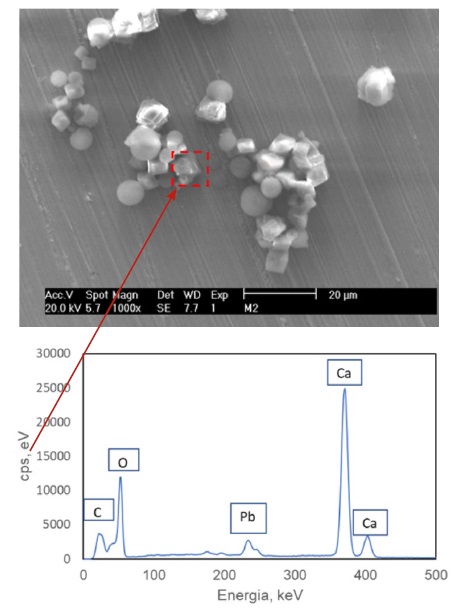 La adición de Na2CO3 a una solución saturada de sulfato de calcio (0.016 mol/L CaSO4) promueve la precipitación del calcio como CaCO3, tal como la modelación termodinámica lo sugiere. En la Figura 5 se observa el sólido obtenido en el experimento 11, el cual fue identificado mediante DRX como calcita y/o vaterita, sobre la superficie de galena. El análisis semi-cuantitativo mediante EDS detecta la presencia de Ca, C y O. La composición en porcentaje atómico es: 17.13% At de Ca, 20.15% At de C y 62.07% At de O, lo que sugiere la presencia de un carbonato de calcio. Es interesante observar dos morfologías distintas, una en forma de esfera y la otra de rombos apilados. Esto corrobora la existencia de dos especies en el sólido obtenido, calcita (romboédrica) y vaterita (di-hexagonal). Además, se observó que existe una adhesión de CaCO3 en la superficie mineral. Sin embargo, el tamaño de las partículas del CaCO3 (aprox. 7 µm) es menor al compararlo con las partículas de yeso (aprox. 38 µm) [13].