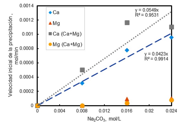 En la Figura 6 se presentan los resultados obtenidos en los experimentos de remoción de Ca y Mg. En el gráfico se observa que, en el caso del calcio, tanto solo como con la presencia del Mg, su velocidad inicial de precipitación (%/min) incrementa conforme la concentración de Na2CO3 aumenta; es decir, se observa que aparentemente la velocidad inicial tiene un comportamiento lineal respecto a la concentración de carbonato de sodio adicionado. También se puede observar que, la remoción de Ca solo y Ca+Mg es muy similar; por lo anterior se puede inferir que la presencia del Mg no tiene algún efecto en la remoción de Ca. En relación con la remoción de Mg, se puede observar que la remoción es mayor con Mg solo y esta aumenta también con una mayor adición de carbonato de sodio; sin embargo, este comportamiento no parece lineal, sino que da inicio una vez adicionada cierta cantidad de Na2CO3 (mayor a 0.008 M). Además, la precipitación de Mg es menor que la de Ca. Los resultados sugieren que la remoción de Mg sí se ve afectada por la presencia de calcio en solución, probablemente debido a que el calcio consume preferencialmente al ion carbonato.