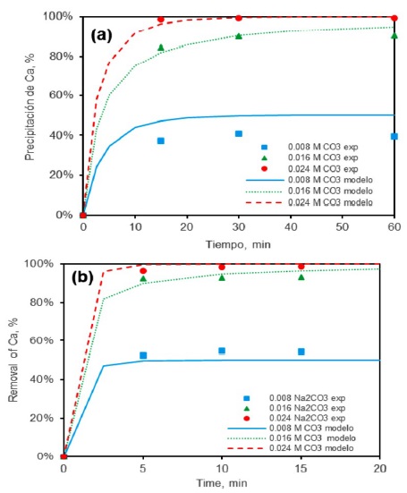 Con la ecuación (10) y (14) y se estimó la concentración y la precipitación de calcio en cualquier tiempo. Esta precipitación se representa con una línea punteada en la Figura 7. Como se mencionó anteriormente, la temperatura tiene un efecto en la remoción de Ca, por lo que se consideraron k distintas. Una k=19.06 (L2/mol2 min) para los datos experimentales de T=17 °C y una k=112.205 (L2/mol2 min) para una T=25°C. Con el objetivo de analizar el efecto de la temperatura en la remoción de calcio se realizaron pruebas con dos temperaturas distintas (17 °C y 25 °C). Los resultados de este análisis se presentan en la Figura 7. En la Figura 7(a) se observa que a una temperatura de 17 °C la precipitación de calcio aumenta con concentraciones mayores de carbonato de sodio. Sin embargo, para un tiempo de reacción de 60 min y adiciones estequiométricas (e.g., 0.0016 M) y superiores (0.0024 M) el incremento no es notable. Por ejemplo, con una concentración de 0.016 mol/L de Na2CO3 la remoción de calcio es del 90%, mientras que con 0.024 mol/L de Na2CO3 es del 99%.