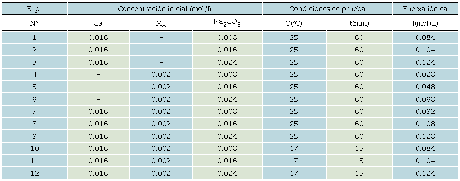 En el presente trabajo se prepararon soluciones con una concentración de 50 mg/L de magnesio (0.002 mol/L MgSO4●7H2O) y 650 mg/L de calcio (0.016 mol/L CaSO4●2H2O). Para preparar las soluciones se utilizó agua desionizada y se adicionó Na2CO3, se utilizaron 3 concentraciones distintas (0.008, 0.016 y 0.024 mol/L); todos los reactivos utilizados fueron grado reactivo. Para filtrar la solución se utilizó papel filtro con un tamaño de retención de partícula de 2.5 μm y una bomba de vacío.