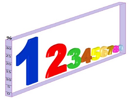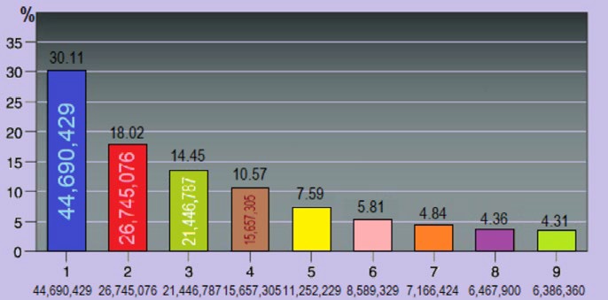 La Ley de Benford describe el comportamiento que siguen los dígitos significativos (primera, segunda, tercera, ..., k-ésima posición en una cifra) de una secuencia determinada de números suficientemente grande, la cual establece que alrededor del 30% de tales dígitos empiezan con el número 1, aproximadamente el 18% con el número 2, y así sucesivamente hasta 5% que empiezan con el número 9 (la figura 1 ilustra esquemáticamente este hecho). La Ley de Benford también se conoce como Distribución Logarítmica.