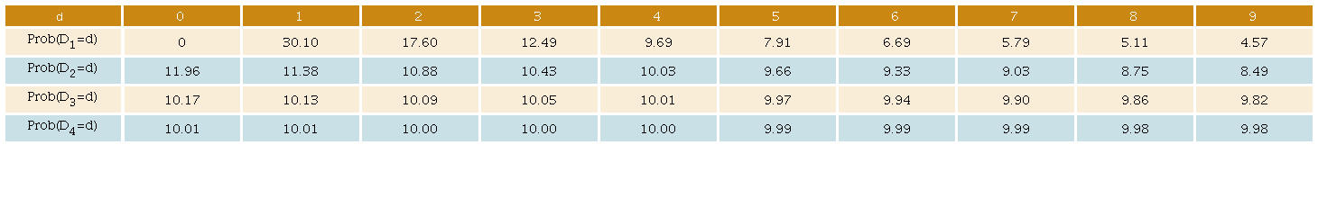 En la tabla 1 se incluyen las probabilidades de ocurrencia para los primeros cuatro dígitos significativos, mismas que se obtuvieron al utilizar las fórmulas respectivas, verificando el resultado presentado en [2]. Además, enseguida se presentan ejemplos específicos.