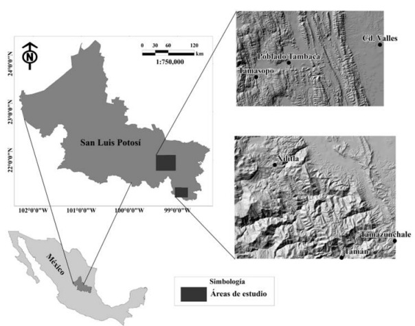 Para este estudio se localizaron afloramientos de las formaciones Agua Nueva y San Felipe, en las zonas aledañas a Ciudad Valles, Xilitla y Tamazunchale, S.L.P., lo cual cubre, aproximadamente, un área de 6,300 km2 (Figura 1). El área total fue clasificada en dos zonas principales: zona norte y zona sur. Paleogeográficamente, la zona norte se encuentra dentro de la PVSLP y la zona sur en la CTM. La zona norte presenta estructuras con una tendencia N-S (Figura 2), mientras que en la zona sur se observa una mayor diversidad en la longitud y dirección de las estructuras (Figura 3).