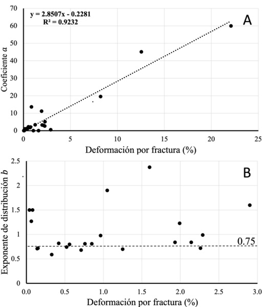 Para este estudio se comparó el alargamiento generado por las fracturas con el exponente y el coeficiente presentados en las tablas 4 y 5. Se encontró que el coeficiente (Figura 10A) muestra un crecimiento lineal conforme va aumentando la deformación, con un valor de R2 = 0.92, lo cual tiene sentido en tanto una mayor cantidad de fracturas hospeda una mayor extensión. Por otra parte, para el exponente , despreciando los scanlines de afloramientos menores a 1 m, su rango de valores parece mantenerse entre 0.5 y 1 (Figura 10B), obteniendo una media de aproximadamente 0.75 y con una desviación estándar de 0.2. Este valor se encuentra dentro del rango de los valores de en leyes de potencia reportados en la literatura para calizas [8], [26], [15]. A partir de estas relaciones es posible realizar extrapolaciones de fracturas en la Formación Agua Nueva, conociendo la intensidad de fractura de la zona y utilizando el exponente de distribución obtenido anteriormente. Como lo exponen Hooker, Laubach, y Marrett [5]: “Imagine un caso hipotético en el cual el espacio promedio de fracturas visibles (>0.1 mm de apertura) es igual al ancho de un núcleo (100 mm). Si tal población de fracturas obedeciera a una distribución de ley de potencia con = 0.8, entonces en fracturas por mm sería 0.0016. Debido a esta pendiente poco abrupta, ~40 fracturas mayores a 1 micra de apertura estarían presentes dentro del núcleo”.