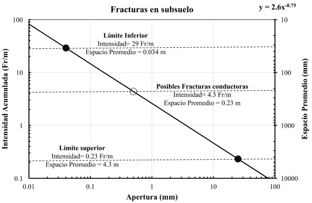 La intensidad de fractura se refiere a la cantidad de fracturas de determinada apertura que existen por unidad lineal (cm, m, km). Para conocer la intensidad de fractura utilizamos el método de Ortega, Marrett y Laubach [8]. En este se grafica la apertura de cada fractura medida de un determinado scanline contra su intensidad acumulada. Para calcular la intensidad acumulada, se ordenan las fracturas de mayor a menor apertura y se les otorga un número acumulado consecutivo (1 para la fractura más grande, 2 para la segunda más grande, etc.) y se divide por la longitud total del scanline.