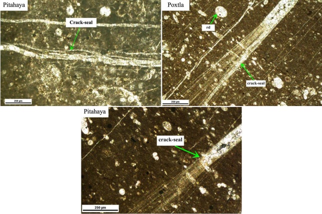 Solo se encontró textura tipo crack-seal en la Formación Agua Nueva, mas no en la Formación San Felipe (Figuras 6c y Figura 12). En su lugar fueron observadas fracturas angostas y aisladas completamente selladas con calcita (Figura 6D). La textura crack-seal es generada durante cada incremento de apertura individual. Con cada pulso, la fractura se ensancha un poco. Esto es aprovechado por el cemento, el cual sella la fractura; sin embargo, cuando la fractura es demasiado ancha para la cantidad de cemento disponible, no es sellada en su totalidad. En su lugar, se forman algunos puentes de cemento que evitan que la fractura se cierre, dejando espacios vacíos alrededor de ellos que pueden generar porosidad [28].