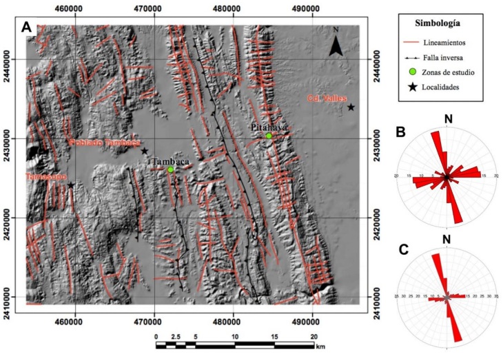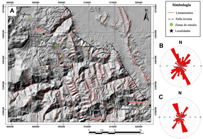 En la región norte (Figura 2), las estructuras muestran una tendencia NNW-SSE, y longitudes paralelas a las fallas inversas. Dichos lineamientos son cortados perpendicularmente por estructuras con una menor longitud y orientación preferencial NNE-SSW, presumiéndose como posibles fracturas de extensión (Figuras 2 B y C). Por otra parte, en la zona sur (Figura 3A), las trazas de los lineamientos presentan cierta curvatura y la longitud de los pliegues es menor que en la región norte. Esto podría atribuirse a un mayor contenido de arcilla en la CTM [20]. A pesar de ello, la orientación preferencial de los pliegues y fallas inversas coincide con la tendencia NNW-SSE encontrada en la zona norte y es cortada perpendicularmente por fracturas de extensión (Figura 3 B y C).
