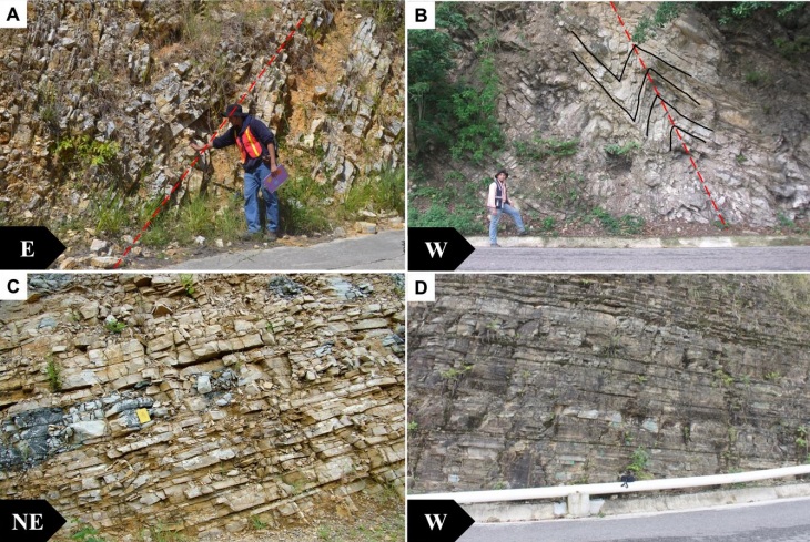 La mayoría de las localidades en la zona sur presentan un plegamiento muy intenso, con pliegues tipo chevrón y plano axial inclinado 50-60º hacia el W (Figuras 4 A y B). Los afloramientos que se encuentran en el sector norte del área forman parte del flanco de una estructura mayor y sus estratos no poseen inclinación mayor a 30 grados (Figura 4 C) y algunos otros no mayor a 10 grados (Figura 4 D). En la Tabla 1 se presenta un resumen de las características de cada localidad.