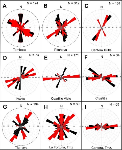 La intensidad de fractura es variable para cada localidad, desde 0.73 fracturas/m en Pitahaya, hasta 50.15 fracturas/m en Tambaca en el conjunto NW-SE. Esta variación se podría explicar debido al mayor grado de deformación tectónica que se aprecia en la localidad de Tambaca (Figura 4A, Tabla 2).