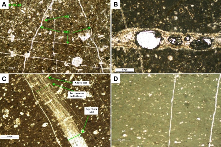 Las microfracturas de la Formación Agua Nueva se encuentran selladas por una fase de cementación sin-cinemático. Aunque se observó porosidad en varias fracturas (Figura 6B), dicha porosidad fue encontrada a partir de fracturas mayores a 0.5 mm. Debajo de ese rango, el cemento fue suficiente como para sellar por completo las fracturas, ya que impidió algún tipo de porosidad. Por esto, se establece un valor de 0.5 mm como el tamaño de apertura mínima o emergent threshold[25]. La mayoría de las fracturas presentan trazas rectas. También se observó la presencia de textura tipo crack-seal. Esta textura se describe como un tipo de bandas de cemento paralelas a las paredes de la fractura y que registran cada uno de los repetidos incrementos de apertura que ha sufrido la fractura desde su formación [25], [5] (Figura 6C). Para la Formación San Felipe, las microfracturas son menos frecuentes que en la Formación Agua Nueva, las microfracturas son más delgadas y no se identificó textura tipo crack-seal (Figura 6D).