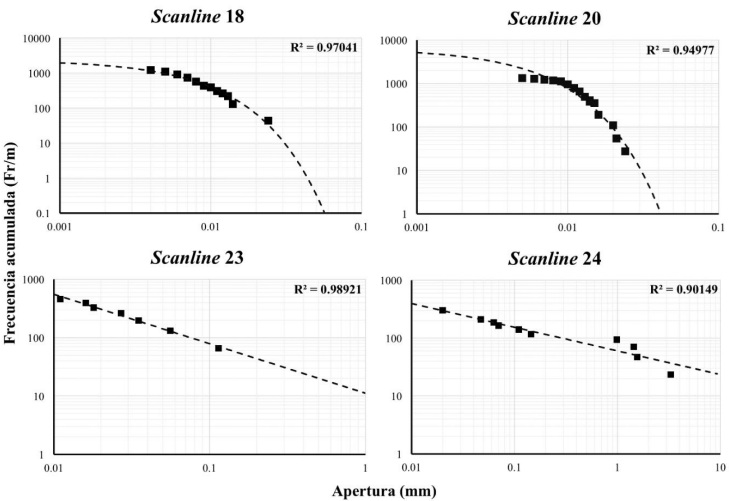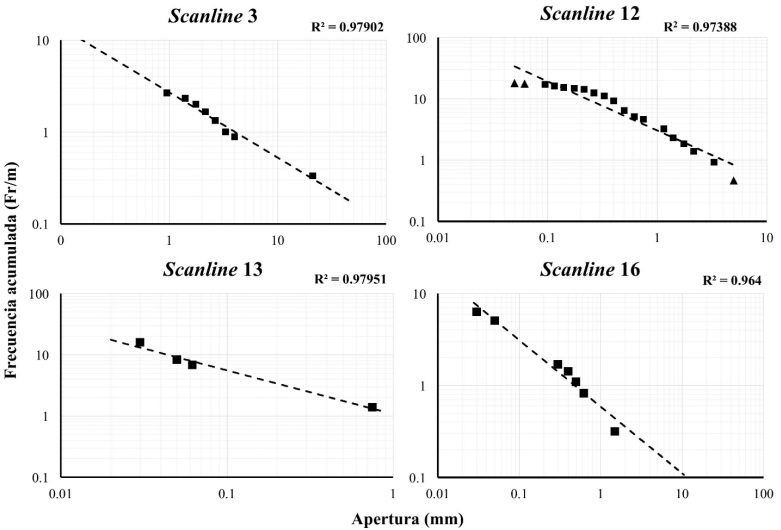 La ecuación de ley de potencia se adapta mejor a la distribución de fracturas (línea recta; Figura 7), aunque en otros casos una ecuación exponencial se adapta mejor (curva cóncava hacia abajo; Figura 7). Debido a factores naturales, es probable que se hayan perdido algunas fracturas pequeñas durante la medición del scanline. Esto se puede ver reflejado en algunas gráficas con una concavidad hacia abajo en los extremos de los datos de apertura menor. Para mitigar este sesgo, a la hora de calcular la correlación (R2), no se consideraron datos que presentan una tendencia hacia este tipo de desviaciones (triángulos en las gráficas; Figura 7).