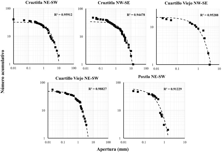 Las gráficas obtenidas fueron modeladas mediante ecuaciones de leyes de potencia (ecuación 1), las cuales se representan como una línea recta en una gráfica logarítmica. La en la ecuación refleja la intensidad de fractura para la apertura seleccionada (X). Matemáticamente, , , en la ecuación de distribución, representa la intersección con el eje cuando log(x) = 0. El exponente , representa la pendiente de la línea [21], [5]. Esto se traduce en que, a mayor , habrá más microfracturas por macrofractura.