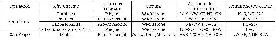 El objetivo de este estudio fue caracterizar la distribución de fracturas en afloramientos análogos, apoyándose con petrografía y datos estructurales. Para ello, se colectaron datos de apertura de fracturas de extensión en afloramientos ubicados en la Sierra Madre Oriental (SMO), para las formaciones productoras Agua Nueva y San Felipe [17], dentro de las paleoprovincias Plataforma Valles-San Luis Potosí (PVSLP) y la provincia petrolera Cuenca Tampico-Misantla (CTM), al oriente de San Luis Potosí (Figura 1). Con esta información, se realizó una comparación de las fracturas entre ambas formaciones, asociadas a campos maduros del noreste de México.