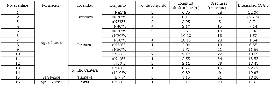 Para realizar este estudio, la principal condición es la vista de fracturas en sus tres dimensiones. Se definieron nueve localidades de estudio que presentan estas características. En cada localidad, y tomando como principal rasgo su orientación, se definieron conjuntos de fracturas. A cada uno de los conjuntos observados se aplicaron los scanlines, obteniendo su apertura y espaciamiento en milímetros, distinguiendo entre selladas o abiertas. Se obtuvieron datos de 341 fracturas mediante 16 scanlines en cinco diferentes localidades. De esta información, 320 datos corresponden a la Formación Agua Nueva, mientras que para la Formación San Felipe se obtuvieron 21 datos de afloramiento (que se complementaron con las microfracturas).