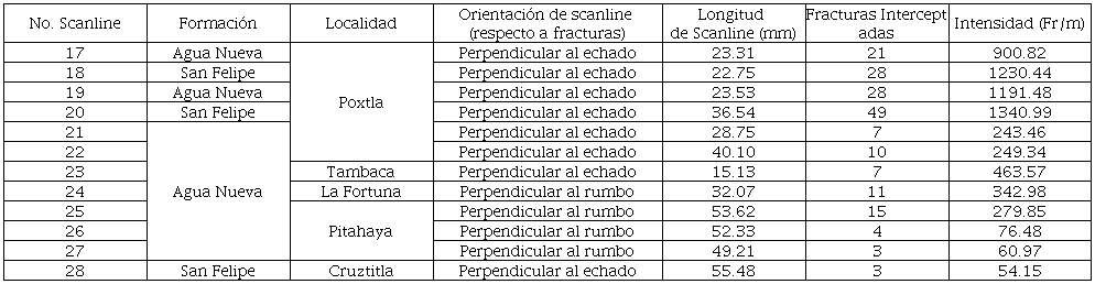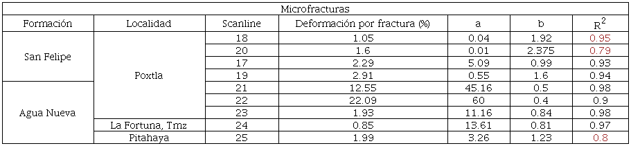 Gran parte de los datos de microfracturas fueron obtenidos de la localidad de Poxtla (Figura 3A). En dicha localidad afloran ambas formaciones. Aquí, los microscanlines se hicieron sobre su plano vertical con rumbo NW-SE, interceptando perpendicularmente el conjunto NE-SW. Dichas mediciones se realizaron sobre su plano de estratificación. Se obtuvieron datos de intensidad de fractura para cada sección delgada. No obstante, para la Formación San Felipe, debido a su escaso fracturamiento, se pudieron generar dos gráficas (scanline 18 y 20; Figura 9). Se graficaron únicamente scanlines a partir de siete fracturas. Estos datos son representados en la Tabla 3. Para el caso de las microfracturas se obtuvieron intensidades de fractura del orden de las miles de fracturas por metro. Para la Formación Agua Nueva (scanline 23 y 24, Figura 9), una ley de potencia sigue modelando mejor a su comportamiento.