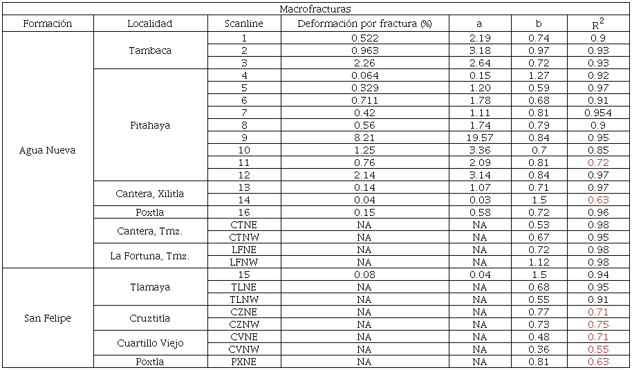 Las gráficas de distribución de fracturas mostradas en la sección anterior indican que una ley de potencia modela mejor la distribución en la Formación Agua Nueva, mientras que, para la Formación San Felipe se adapta mejor una ecuación exponencial. En las tablas 4 y 5 se presentan las magnitudes y para las ecuaciones adaptadas en cada diagrama. Tales valores son útiles en los escalamientos de fracturas. El valor de R2 mostrado en las tablas 4 y 5 es usado para medir el ajuste de los datos a las ecuaciones a las gráficas. Los valores que se denotan en rojo son debido a que la ecuación de tipo ley de potencia es pobremente adaptada. Además, se presenta el valor de deformación por fractura para cada scanline calculado con base en la apertura acumulada de todas las fracturas.