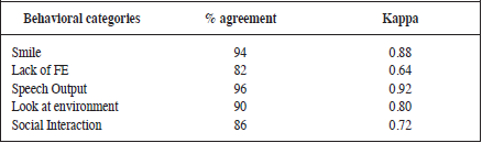 The check-list used included 5 behavioral categories carefully chosen and operationally defined: smile (excluding unmotivated or inappropriate laughter), lack of facial expression, presence of speech output (excluding soliloquy), look at the environment and social interaction. The observers must record the presence or absence of the behavior described as a dichotomous decision, according to the procedure established. Successive pre- and post- treatment observations were performed throughout two periods of 4 weeks immediately before and after the introduction of the program.