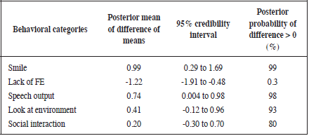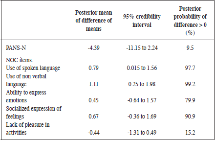 As table 3 shows we did not find relevant differences pre/post for the clinical assessment by using the PANSS-N. However, the results support the existence of relevant changes pre/post with the NOC indicators. In the items “Use of spoken language”, “Use of non-verbal language” and “Socialized expression of feelings”, data show an important increase in the score because the posterior probability that the difference is greater than zero is greater than 90%. This increase is not so conclusive with “Ability to express emotions” and even less with “Lack of pleasure in activities”.