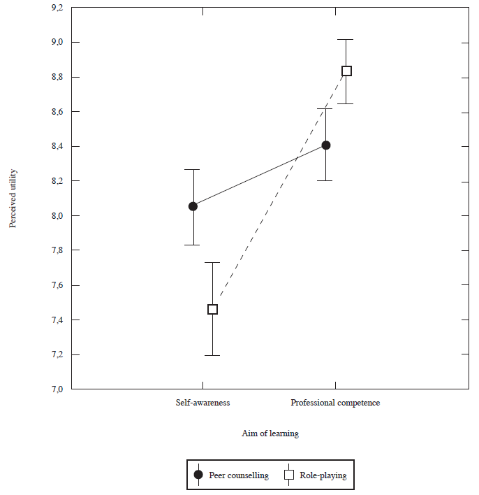 For the skill of empathy, both the main effect of learning and the interaction effect were significant, but the main effect of method was not. Thus, the utility of peer counselling and role- playing differs according to the aim of learning. Figure 1 shows the interaction effect. It can be seen that students perceived greater utility for peer counselling over role-playing in relation to self- awareness (t = 4.38, p < .001, g = 0.33). However, when asked to consider the impact of the empathy skills training on their growth as professionals, students felt that role-playing had been a more useful approach (t = -4.13, p < .001, g = -0.31), although the effect sizes in both cases were small (see Table 3).