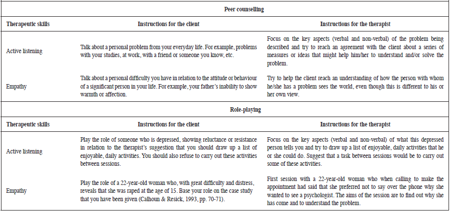 In light of the above the present report has the following objectives: 1) to compare the perceived utility of peer counselling vs. role-playing as methods for teaching trainee clinical psychologists the skills of empathy and active listening, taking into account the impact made in relation to both their self-awareness and their growth as professionals; and 2) to examine the degree of discomfort associated with sharing real personal experiences both before (pre) and after (post) the skills training programme.