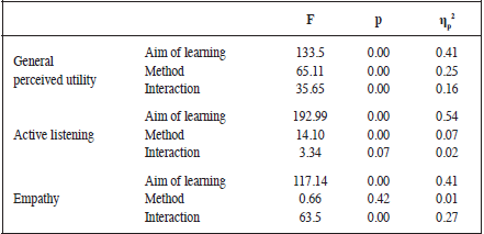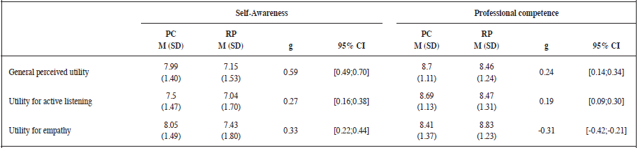 None of the confounding variables had any effect on the dependent variable (results not shown). Table 2 shows the mean and standard deviation for the four conditions for each dependent variable, while Table 3 shows the results of the 2×2 (self-awareness vs. professional competence, and peer counselling vs. role-playing) repeated measures ANOVA for each dependent variable. The eta partial squared statistic is also shown. For general perceived utility, both factors and their interaction showed significant effects. The t test comparisons of interaction showed that peer counselling was regarded by students as more useful than role- playing when it came to enhancing self-awareness and personal growth (t = 8.37, p < .001, g = 0.59) and for developing therapeutic skills (t = 3.75, p < .001), although the effect size was small (g = 0.24). With respect to learning the skill of active listening, the results show a preference for peer counselling in relation to both self-awareness and growth as a professional; although the effect sizes are again small the differences between the ratings given to the two methods (role-playing and peer counselling) are highly significant.