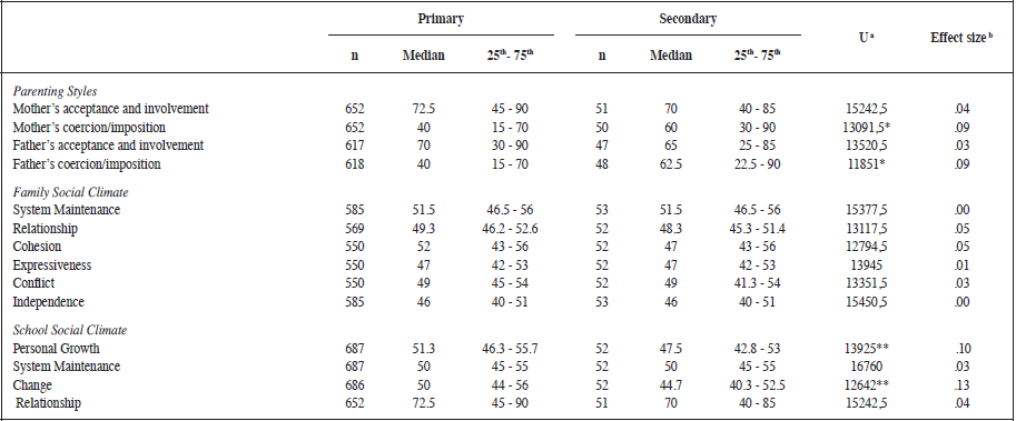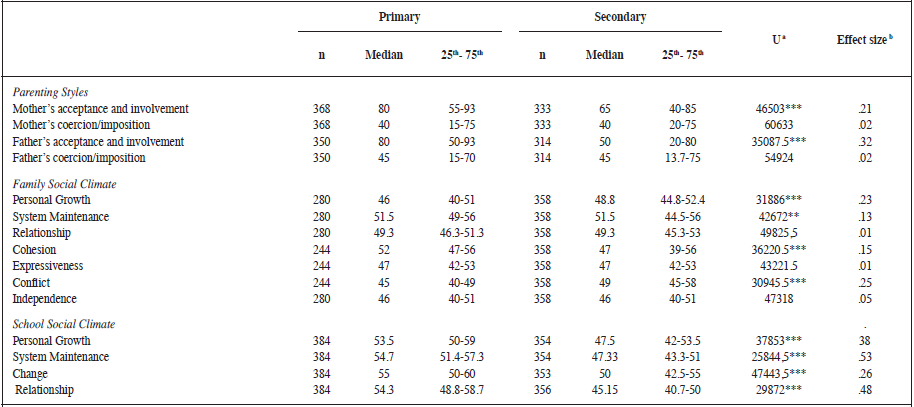 When analysing FSC, the results show that adolescents in primary school score lower than adolescents in secondary school in personal growth, conflict, system maintenance and cohesion. Differences in independence and expressiveness were not significant.
