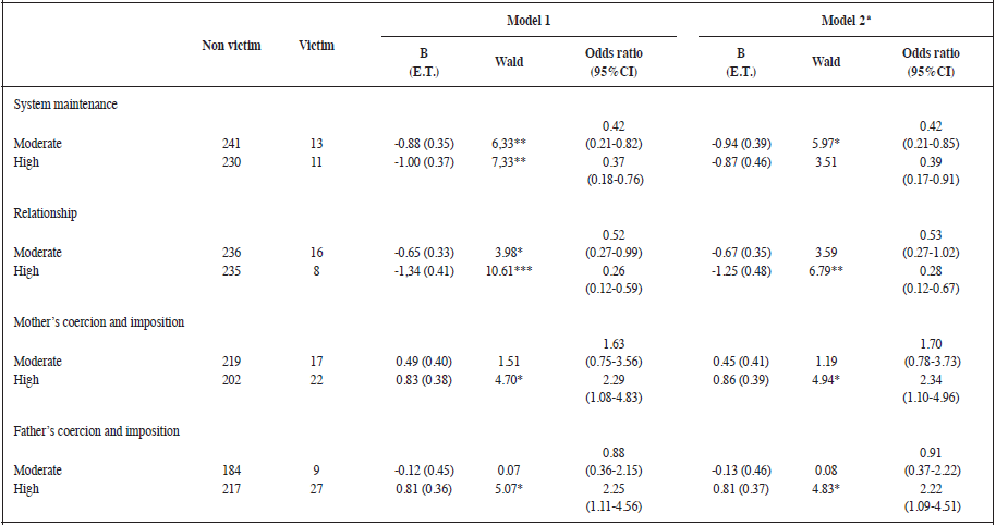 Multiple logistic regression (LR) and a forward stepwise were used to compare victims with no-victims (regarding gender, educational stage, FSC, SSC and Parenting Styles), in order to find out protective or risk factors for victimization. Interaction criteria were revised. In the LR analysis, victim (yes/no) was used as response variable and no-victim as reference category. Variables associated with victimization in previous univariate analyses of relationship, system maintenance, the mother’s coercion/ imposition and the father’s coercion/imposition were scored in quartiles (low, moderate and high) and used as predictors. Low was set as the reference category. Odds ratios were adjusted for gender, educational stage and family social climate variables.